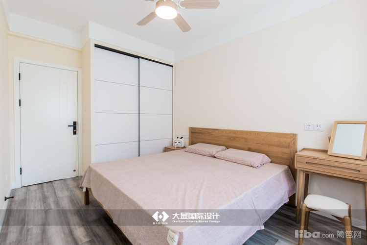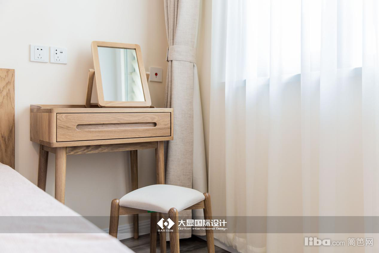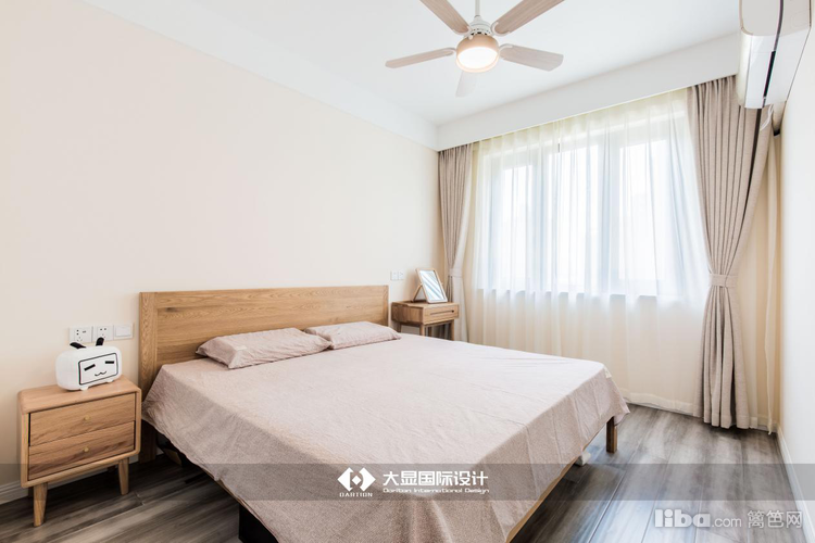 次卧因为以后可能改成儿童房,使用米黄色的墙体,水曲柳木简约风家具,包括窗帘整体都是米黄色系的感觉温馨