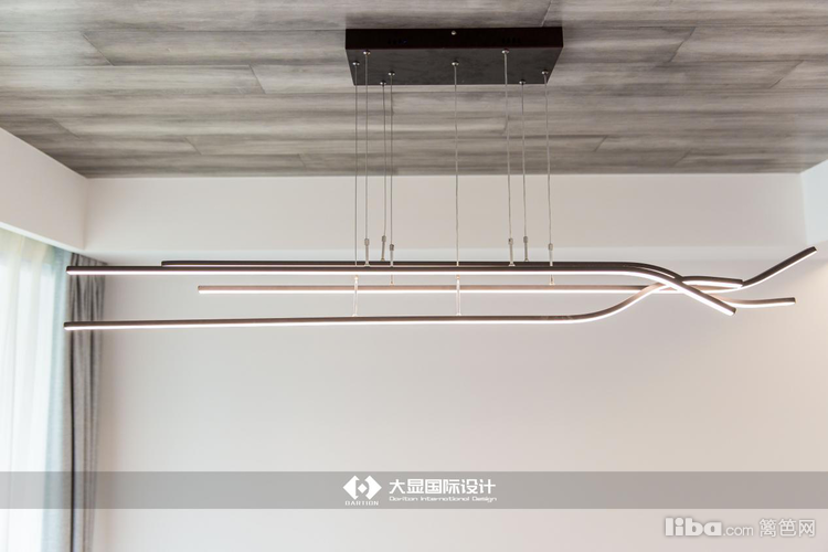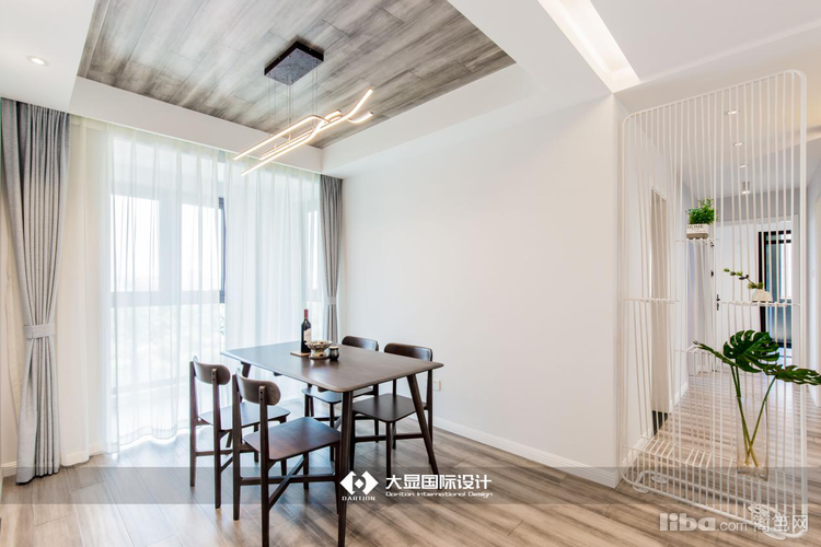 餐厅这里使用了抽象艺术灯,两边都是落地窗,光线充足,格外明亮,而且餐厅的吊顶原木顶面设计,顶底面上下呼应,白色边框吊顶包进去不会显得沉闷。跟屋子的整体格局很搭配。