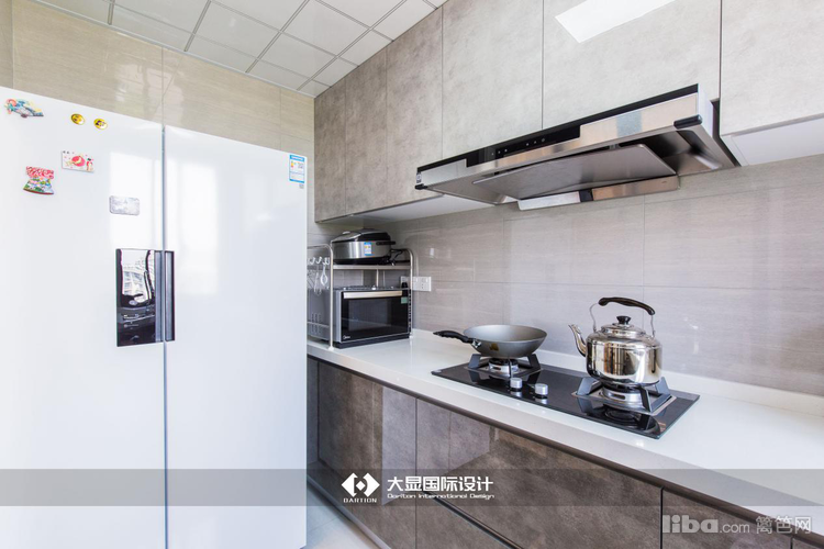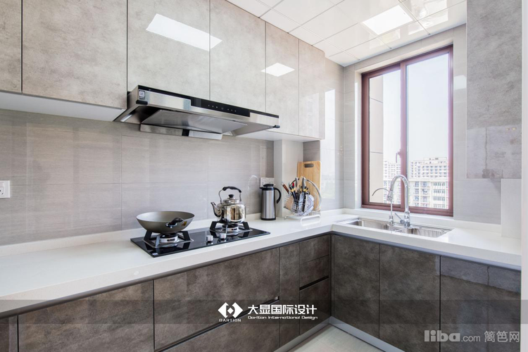 厨房设计为L型厨房,柜门使用了亮面亚克力水泥板材质,视觉上有一种低调粗糙的质感,实际上平整光滑。
