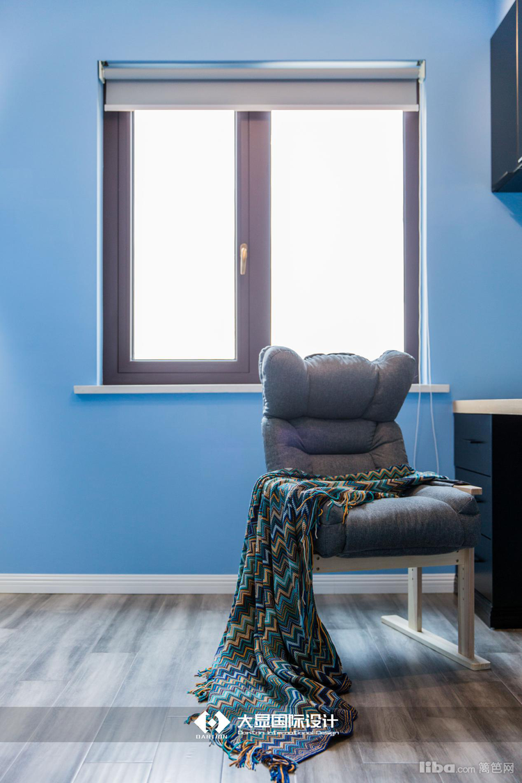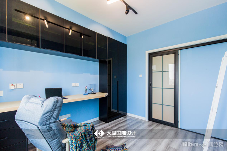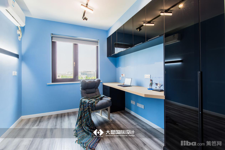 书房整体也为蓝色,与卧室整体颜色相呼应。使用了L型书柜,更有效地使用空间,腾出更大的台面
