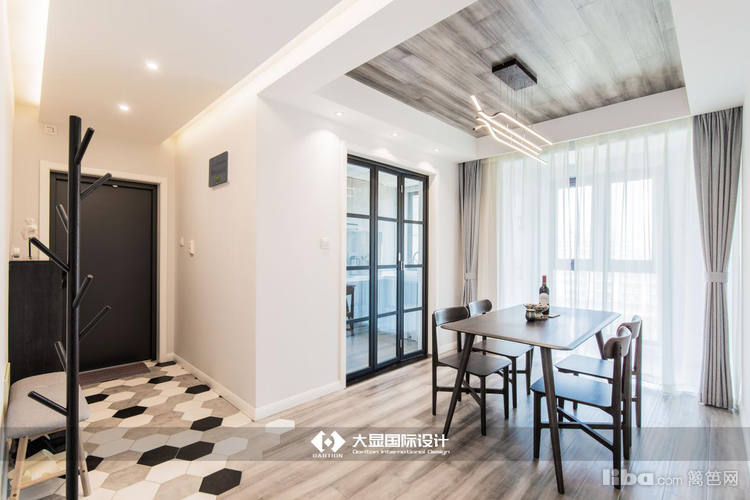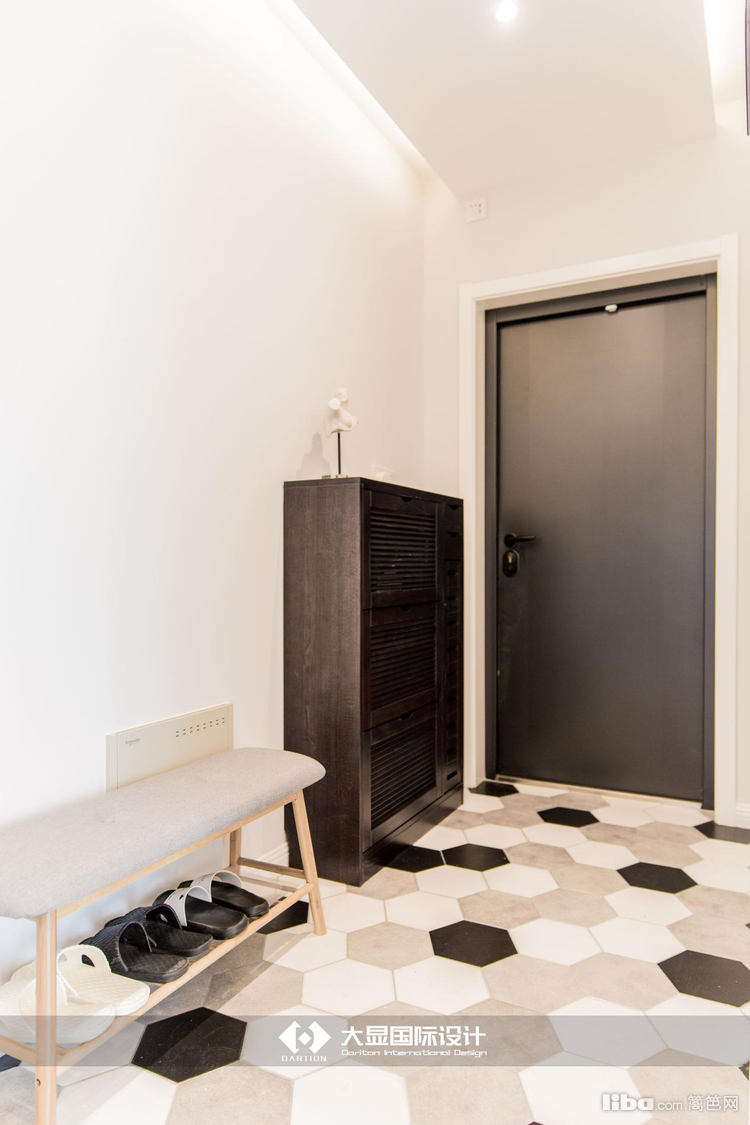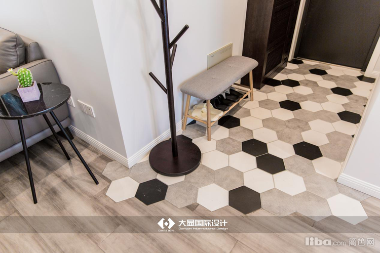 玄关处的瓷砖与屋子里的地板的衔接没有使用传统的过墙石,而是用六角砖黑白灰错落拼色搭配,与地板进行斜切,营造出的空间看起来大胆而又前卫。
