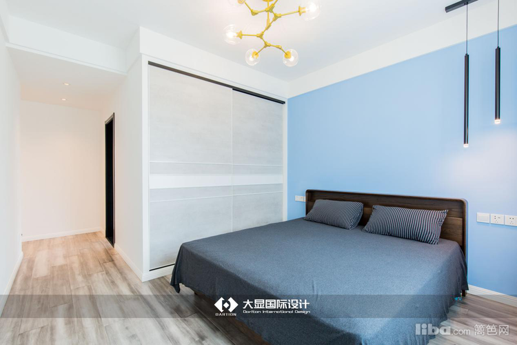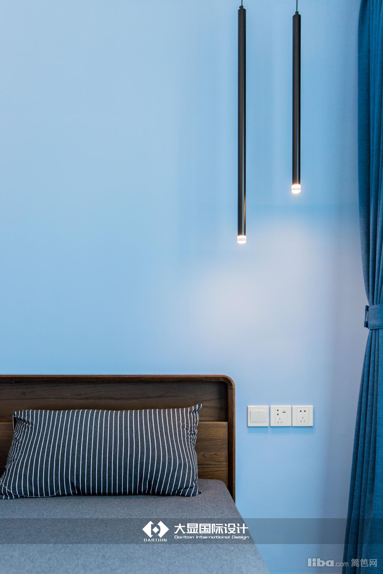 主卧整体色调偏蓝,床头灯没有使用传统的台灯而是使用了造型有设计感的吊灯。