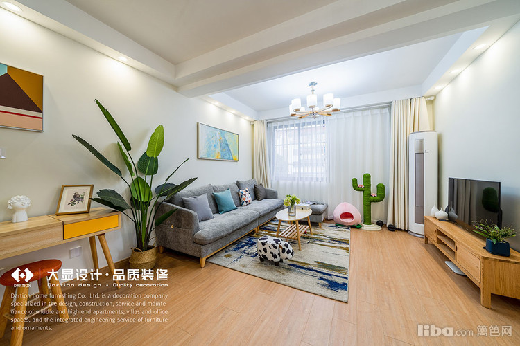 客厅整体风格属于现代简约风,使用浅色系墙面设计营造温馨的家庭氛围,深色的沙发家具舒适又耐脏。