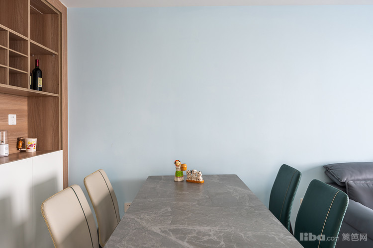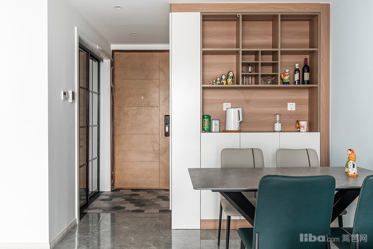 设计师利用餐厅背后的空间也设计乐满墙储物空间,同时也可作为餐边柜来使用。