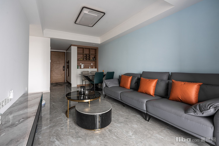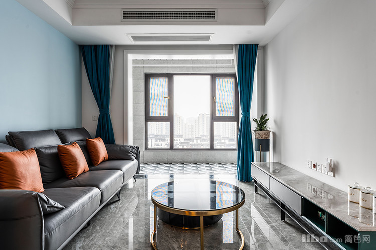 所有家具的“悬浮”使得空间带有一种轻盈纤细的高级感,而不会显得沉重臃肿。拼接茶几镶以金色边框,简单中带着点轻奢的感觉。