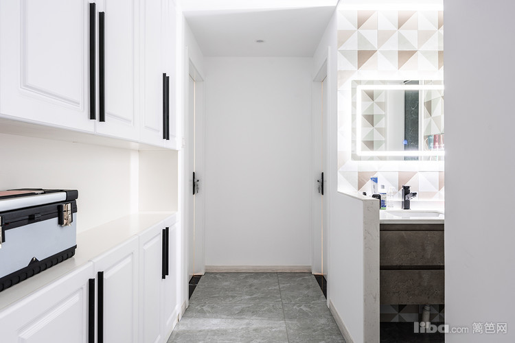 设计师将原本小房间的墙与过道齐平,扩大小房间的房间。 如果过道空间一直延伸到尽头会造成空间的浪费,设计师将过道部分空间包进主卧,做成主卧的衣帽间。