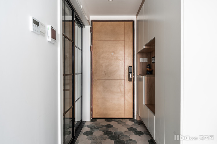 一侧的玻璃移门,给人视觉延伸感也让玄关过道处显得空间更大,黑白灰六角砖搭配木色门,有种影视中的时光感