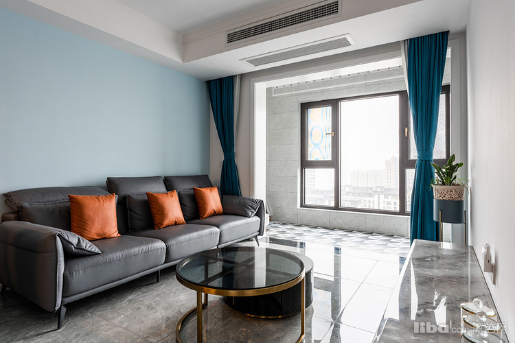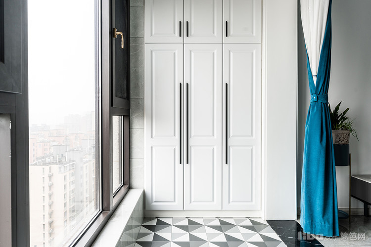 黑白灰的拼色地砖,大而明亮的窗,蓝色的窗帘后面影影绰绰的看到花束,如果有暖黄的阳光进入,那一定很美好。
