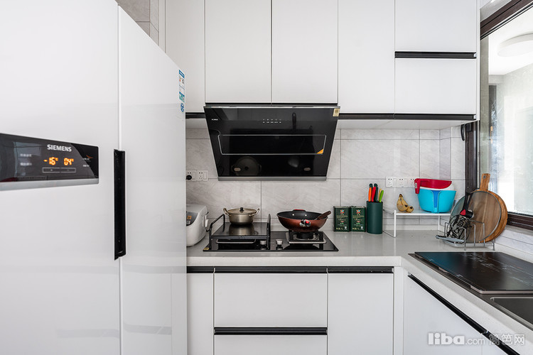 智能冰箱放置在厨房,方便食材的取用。L型厨柜与油烟机上方的厨柜合理利用空间,增加了储物量。整个空间以白色为主,显得比较干净整洁。台面采用易于打扫清洁的板面,不容易留下污渍。