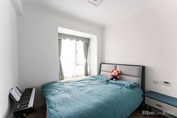 床上的玩具是孩子的最爱,床头的钢琴则是孩子的兴趣爱好。床铺颜色以蓝色为主,有助于孩子的睡眠。