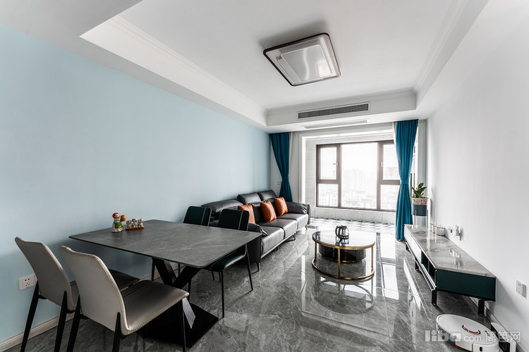 开放式客餐厅互动性良好,凸阳台不能够将两侧墙体打掉,干脆在阳台这里设计大阳台窗,让阳光能够进来。