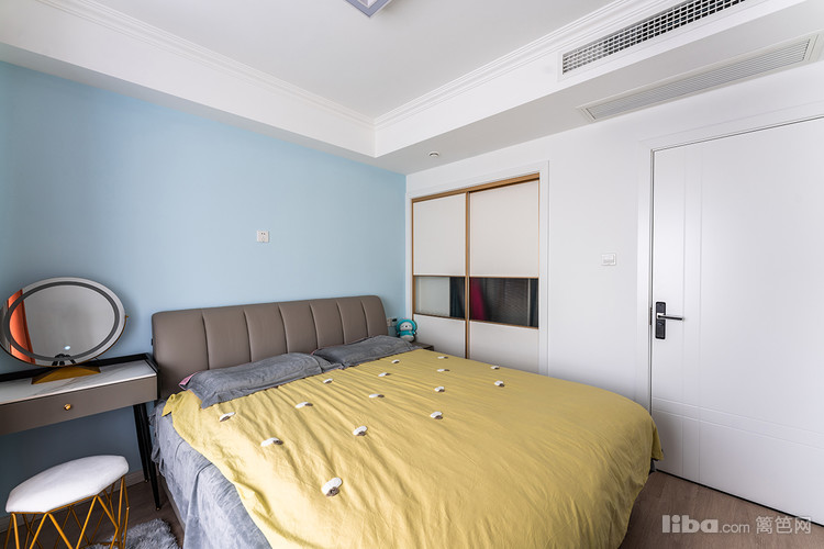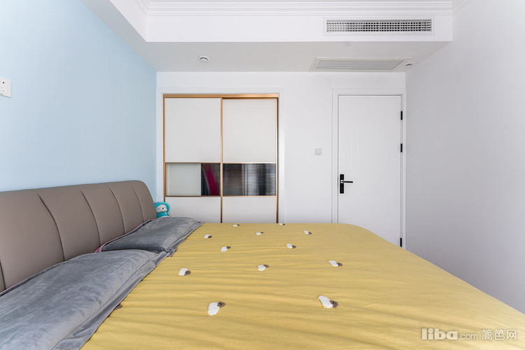 近门的一侧,设置成隐藏步入式衣帽间,左右推拉门的设计,节省空间又方便拿去衣物。