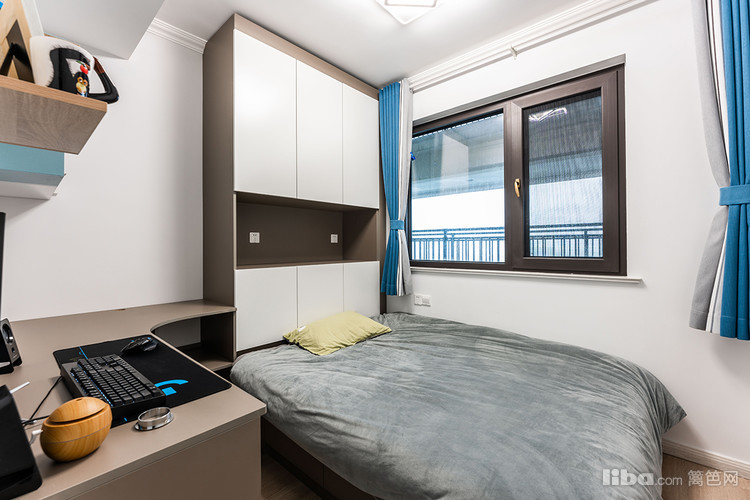 这间卧室是孩子的单独空间,同样的飘窗设计,但没有步入式衣帽间,但还是有一顶天立地的衣柜靠近房门。