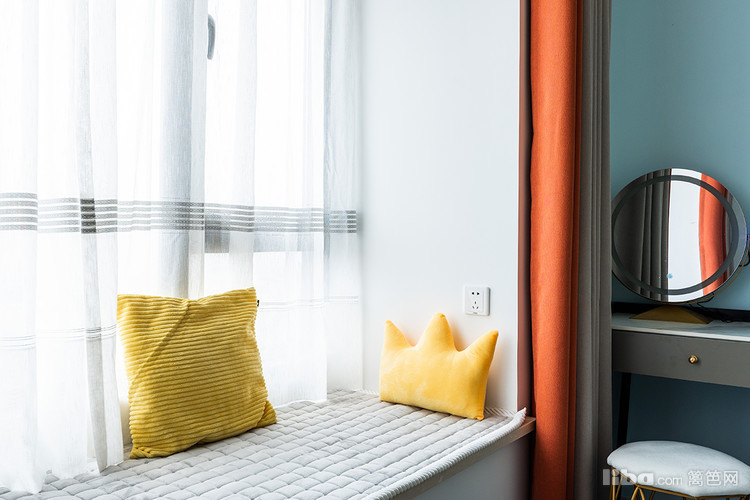 靠近飘窗的一侧有女主人的梳妆台,圆形镜面,映照出美人韵味。