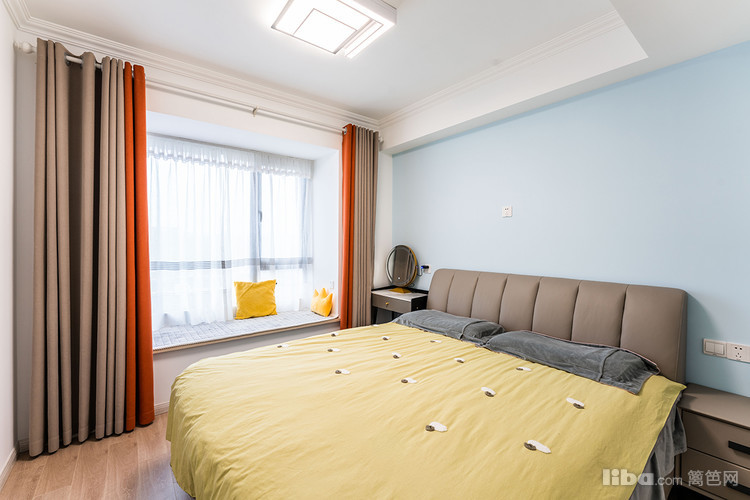 主卧空间比较大,设有飘窗。飘窗上放有两个黄色抱枕,与床铺颜色相映。