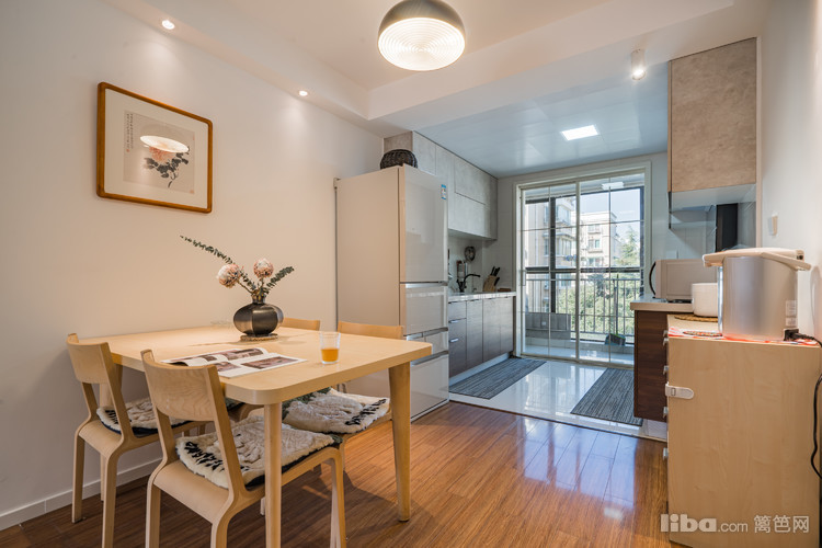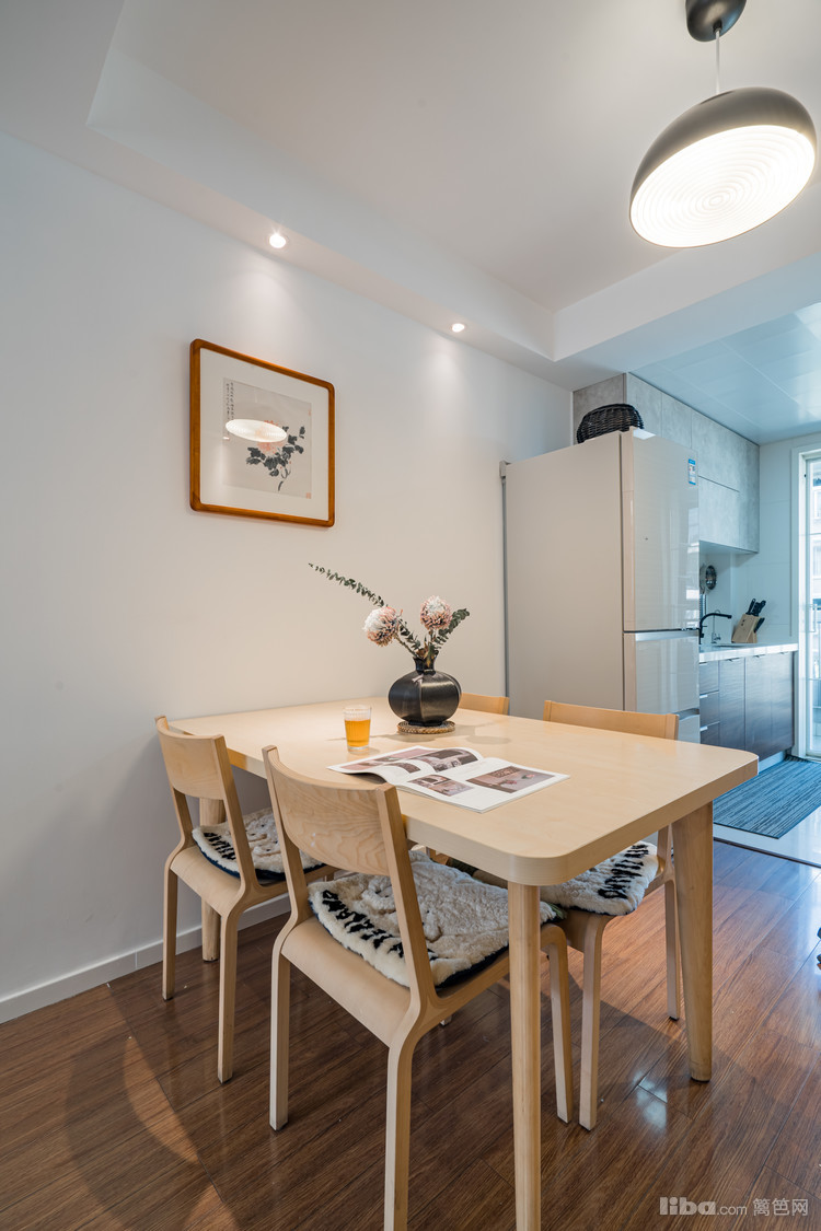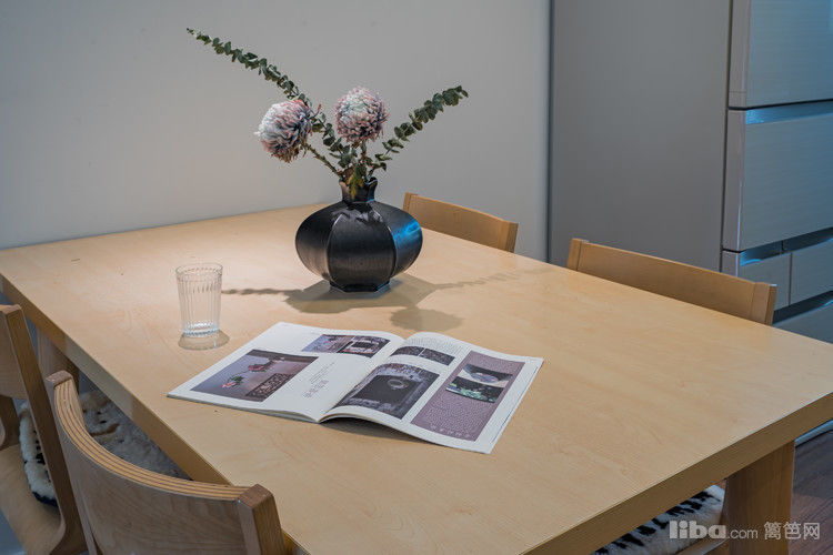 吊灯与筒灯作伴,将餐桌所在空间的光线死角驱除干净。哪怕是茶米油盐,也能诗意如画。餐桌上的插花可以证明,此话不假。座椅上的软垫,是对家人的关心与呵护。