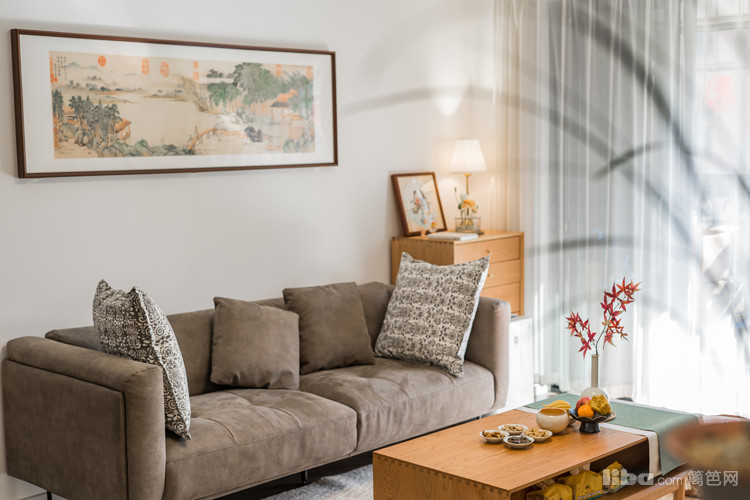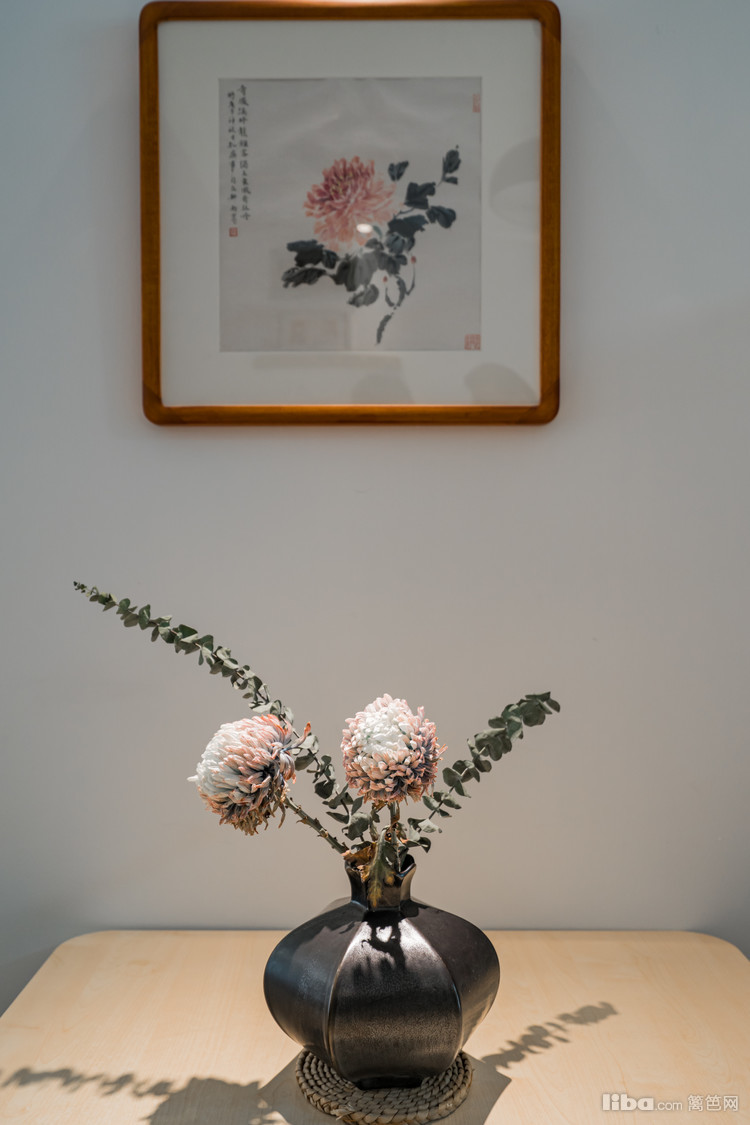 中式山水挂画紧贴墙面,将空落从墙面驱逐出去。沙发旁边的橱柜放置着台灯,柔和的灯光成为插花的太阳。