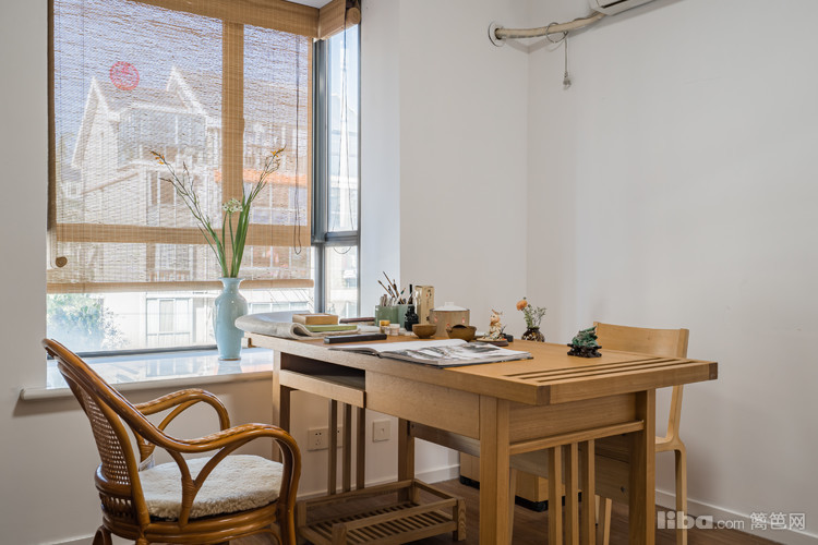 木质桌椅书柜,虽不说将书房占据的满满当当,却也有一席之地。飘窗放置着插花,与书桌进行着慢问慢答。整个空间给人以温润沉静之感,书卷、茶香,看风雪赏春红,这里是心灵的宁静之地。