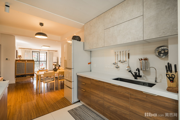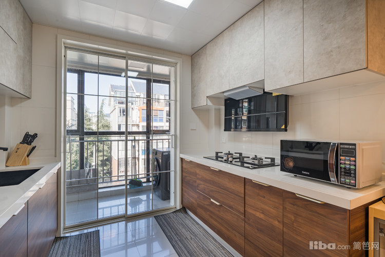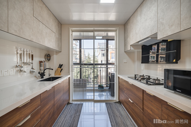厨柜的重木色与白色大理石对比,重心在下。光洁的大理石台面,不易藏污纳垢,给人干净整洁的效果。