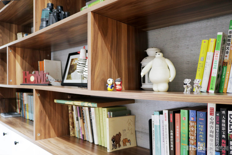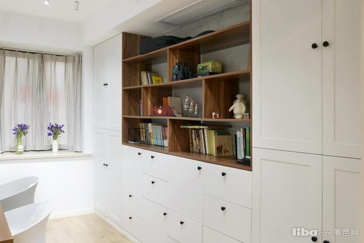 书房的展架两边是巨大的储物空间,中间可以摆放自己的日常物件,椅子上毛茸茸的毯子会让加班工作的你都不想离开