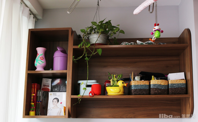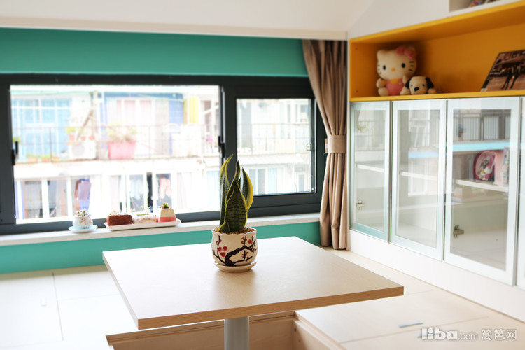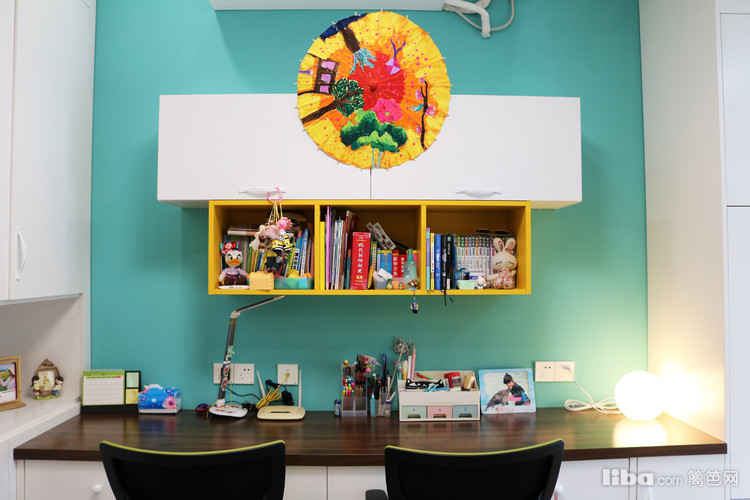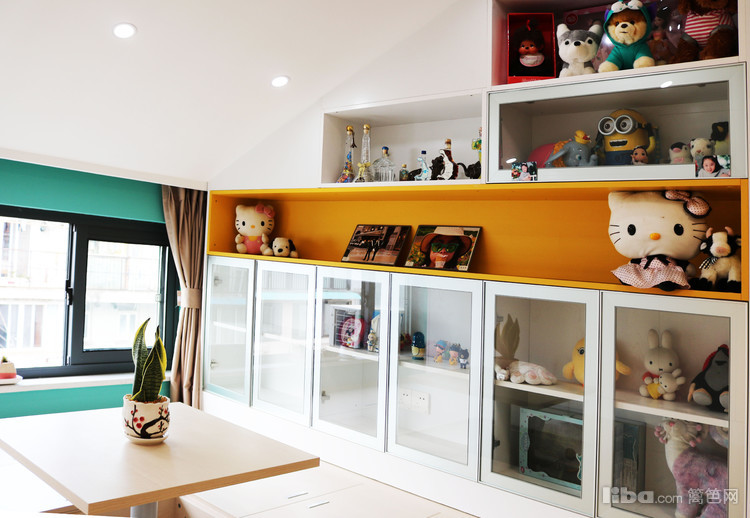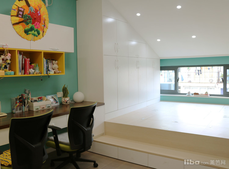书房是二楼的坡顶结构,色调和旁边的儿童房一致。设计师充分发掘了这里的可能性,窗户旁设置了榻榻米,一举多得。同时还有收纳架,孩子的很多玩具都可以摆放在这里。