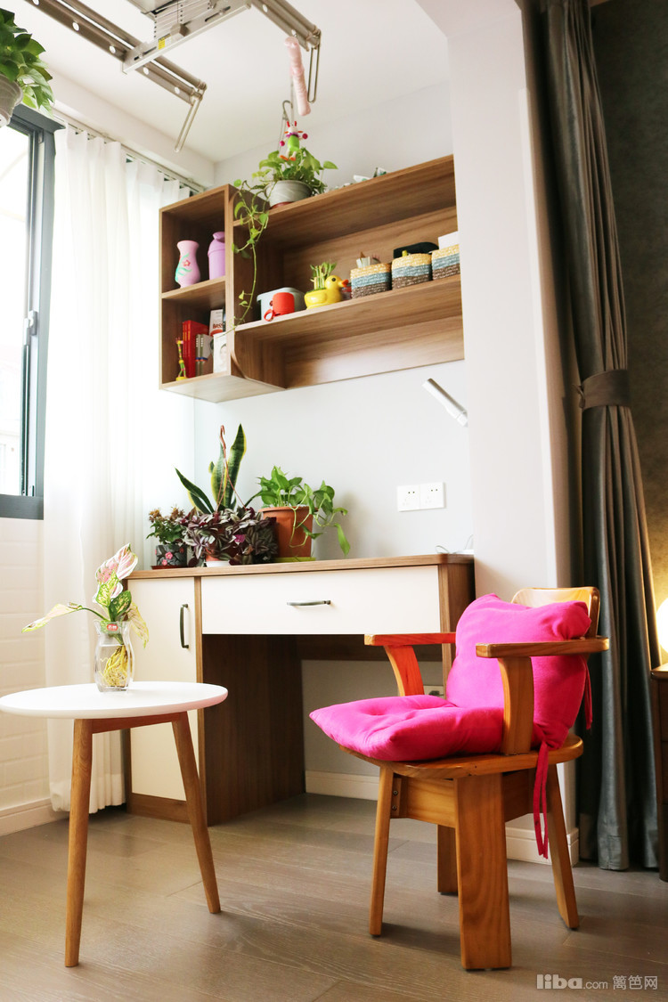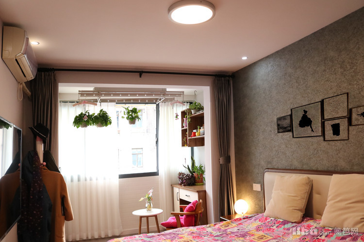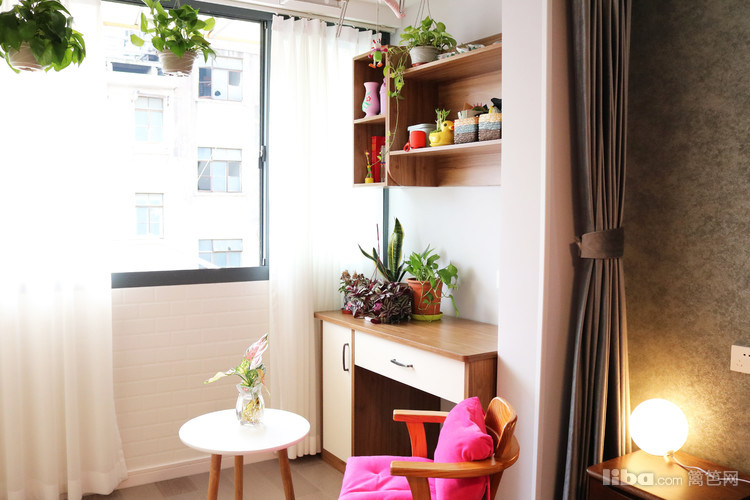 卧室在硬装界面质感色调都比较光滑平淡的前提下,软装设计在各区域的装饰搭配上寻求变化与层次。在阳台上设置了一个小桌子,可以当收纳柜也可以当作梳妆台,非常的具有人性化。