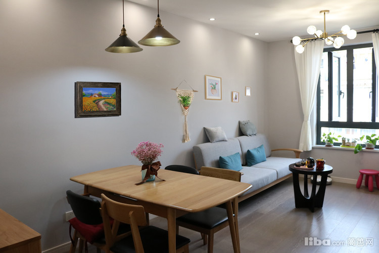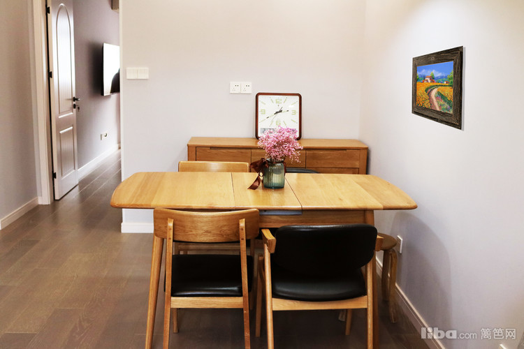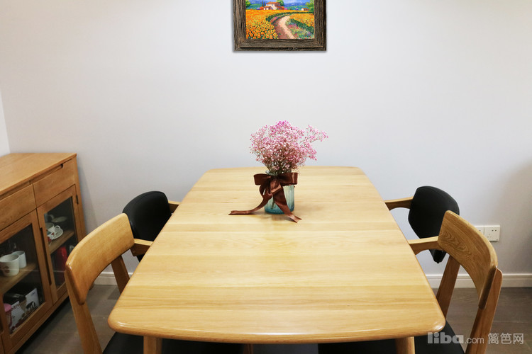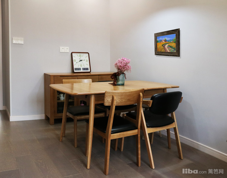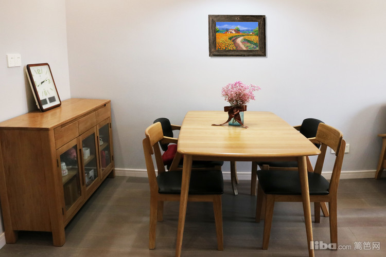 纯实木四人餐桌椅,造型简洁大方,质感温润自然。墙面为挣脱“简单”的头衔,设计师搭配北欧等的挂画等装饰品,在丰富空间的同时还为整块区域添加活力,增添自然气息。