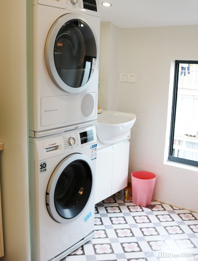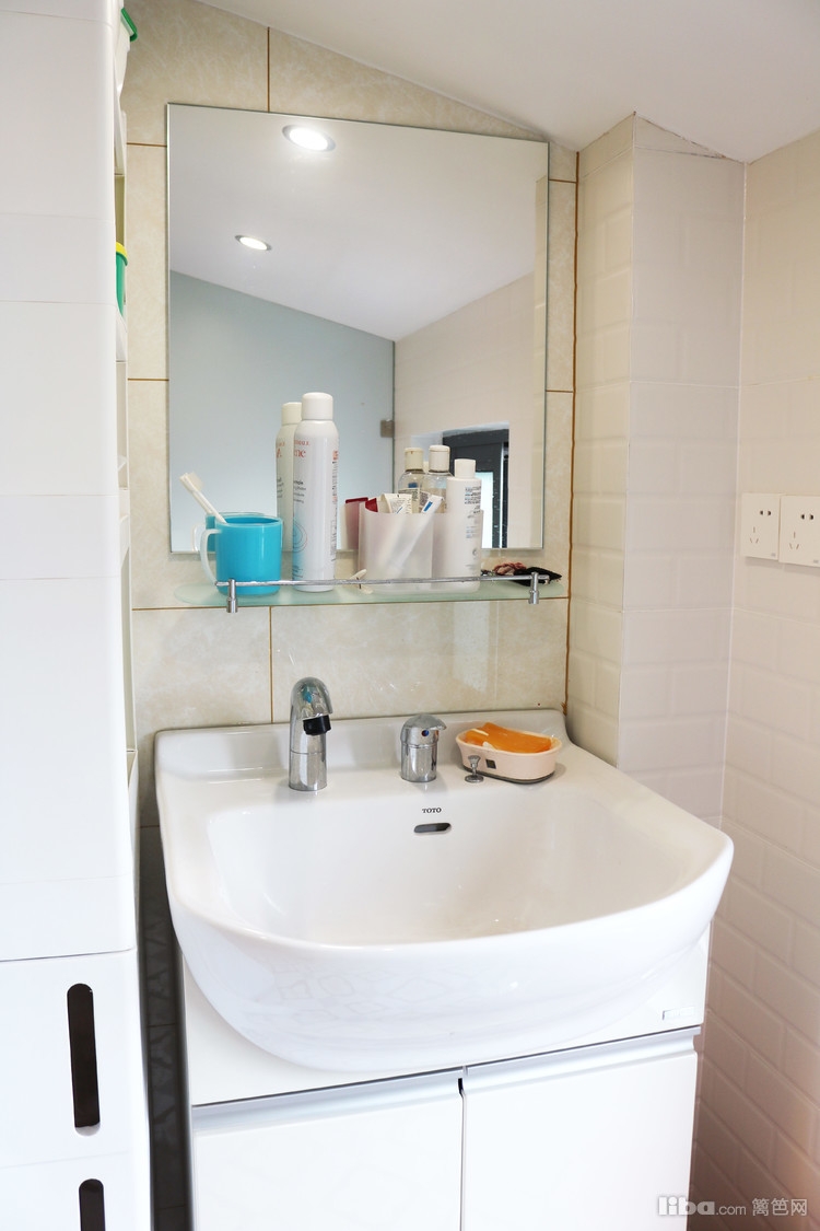 卫生间的主色调糅合蓝白的优雅魅力,洗手台很好的兼顾孩子和大人的身高,打造简约又使用的卫生间。