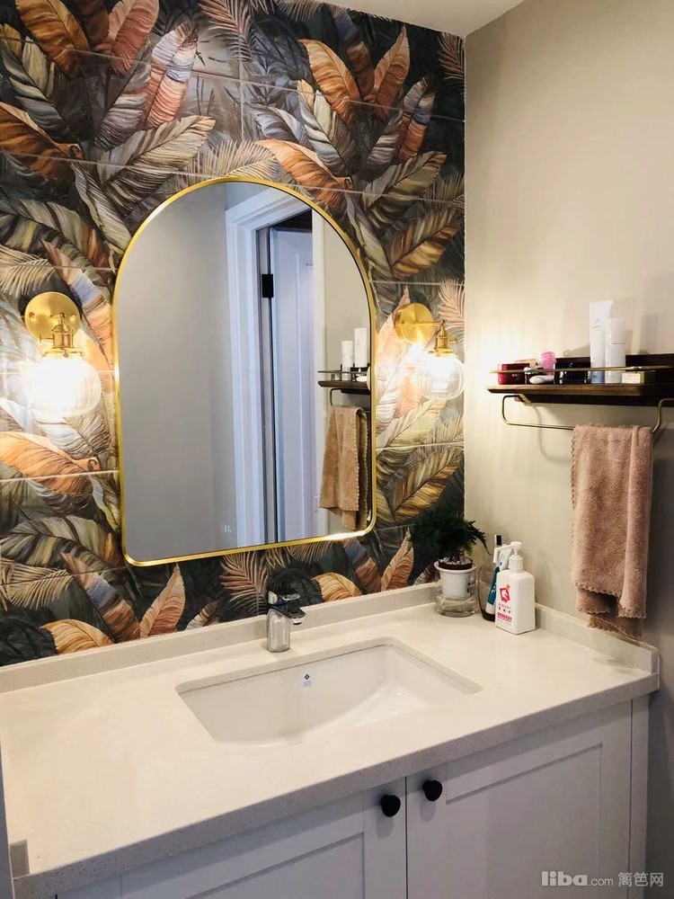 带灰度的脏粉砖,就看不厌。浮雕大花砖,体现复古元素,铜色边框镜子和壁灯,尽显奢华。