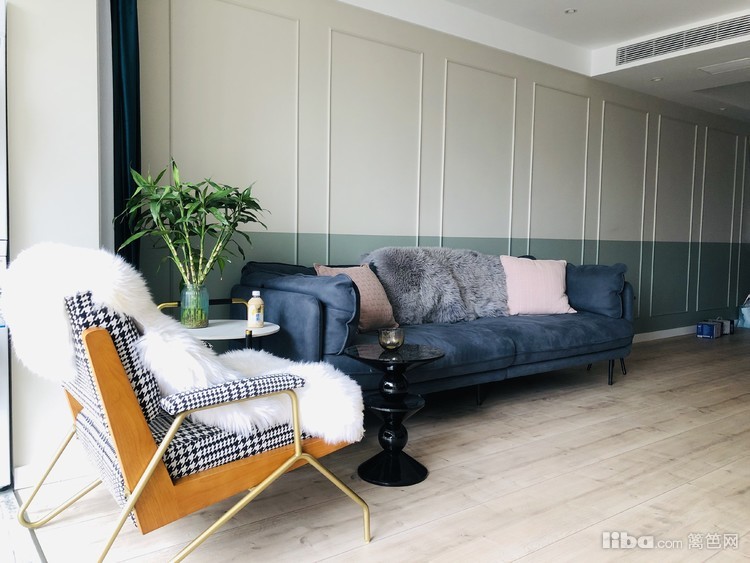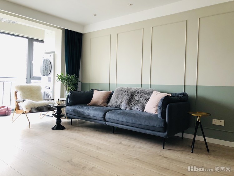 复古绿双色墙,高分子线条,无主灯设计,显得客厅开阔。