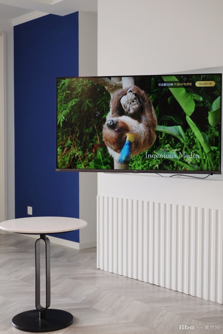 客厅采取白色和蓝色点缀风格,清爽又带有亮点