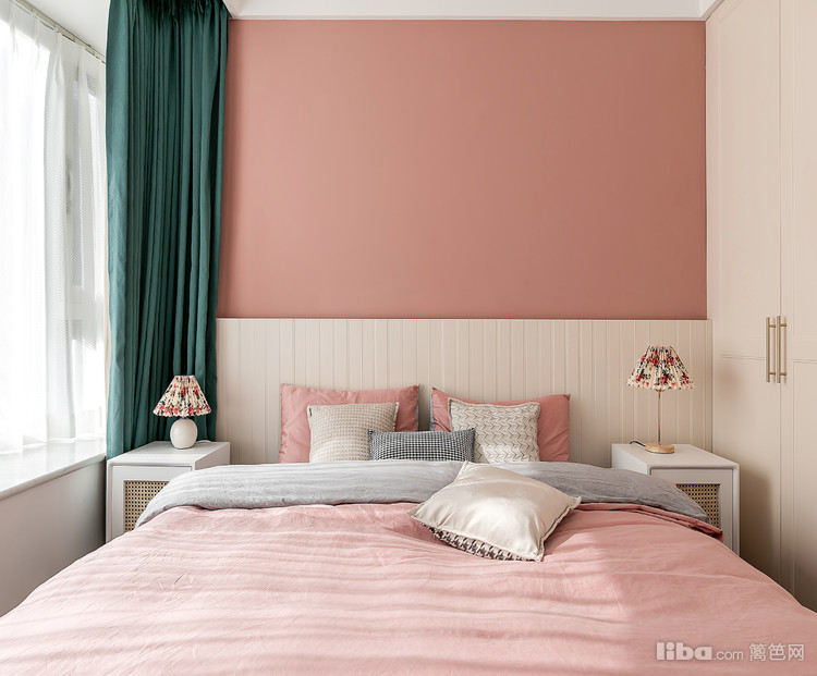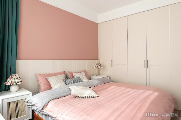 借助主卧空间给到浴缸,避开了床头柜与衣柜冲突的问题,柜子表面类似墙体,颜色统一更显开阔,不会让空间压抑。在色调上保持客餐厅的统一性。碎花台灯以孔雀绿的丝绒窗帘,增添法式的优雅。