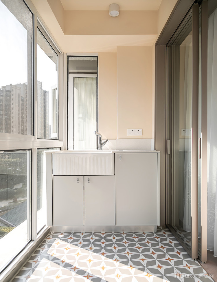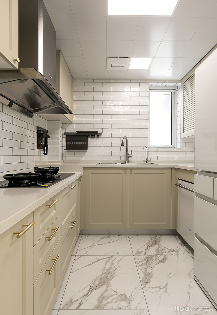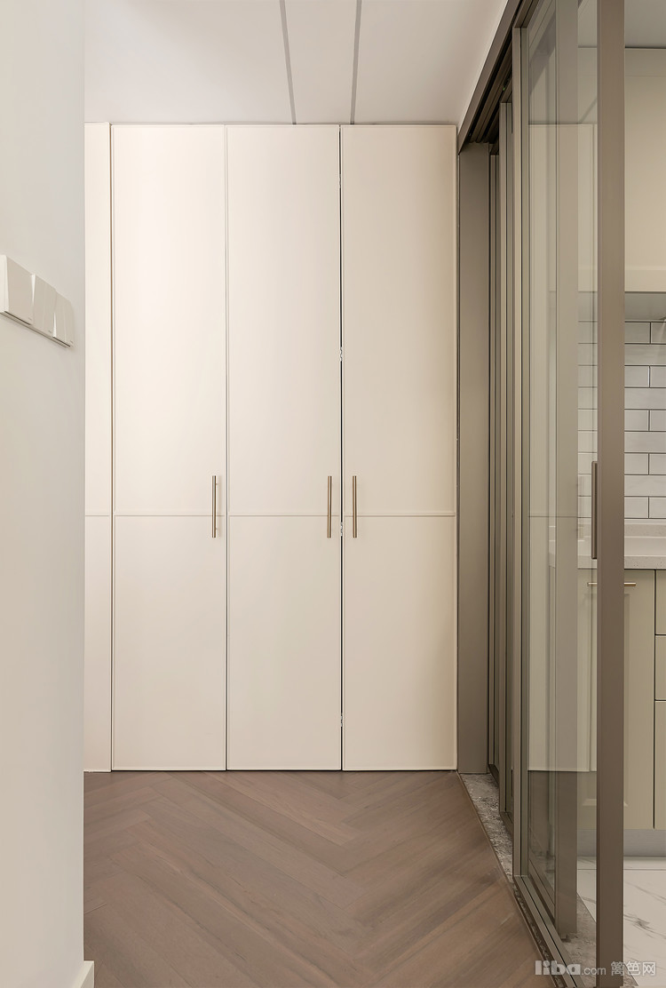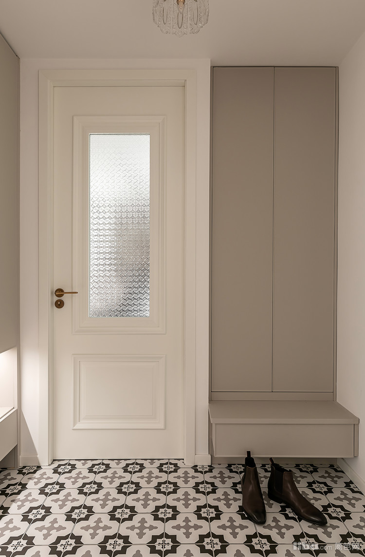 开门瞬间,顶面复古的水晶灯的光影洒落在复古地砖上,米灰色的门板下暗藏灯带,增添灵动及实用性