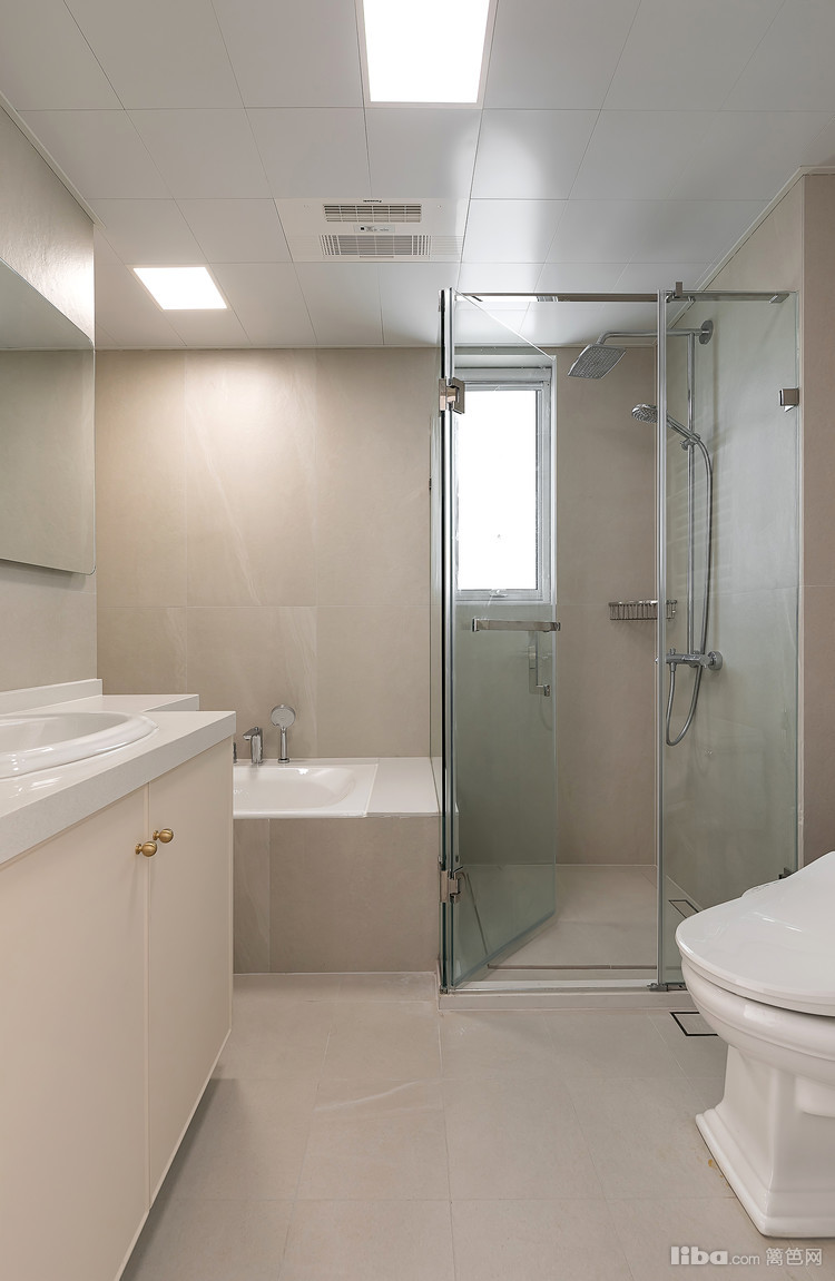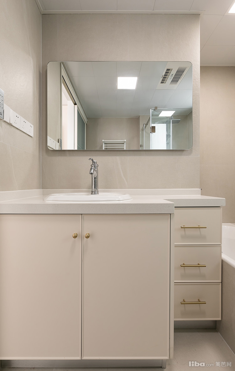 卫生间里按照业主的需求布置浴缸,洗衣烘干机一体机也“隐藏”在这里。
