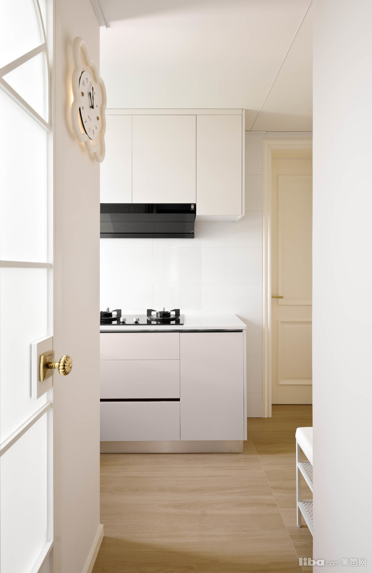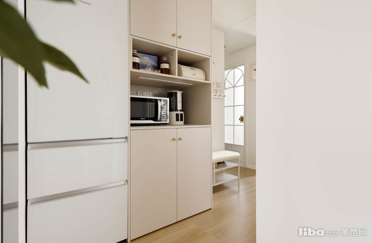 厨房地面采用跟客厅一样的木纹砖,圆弧形垭口门洞,橱柜采用奶油色,半开放式厨房和客餐厅互通,更通透,嵌入式冰箱和餐边柜结合,兼具美观和实用。