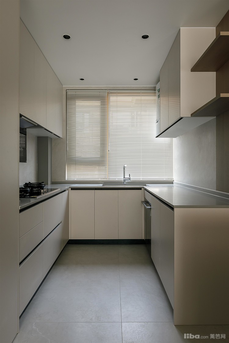 U型厨房设计,最大化台面空间,布局和动线设计合理,柜门免拉手,干净整洁