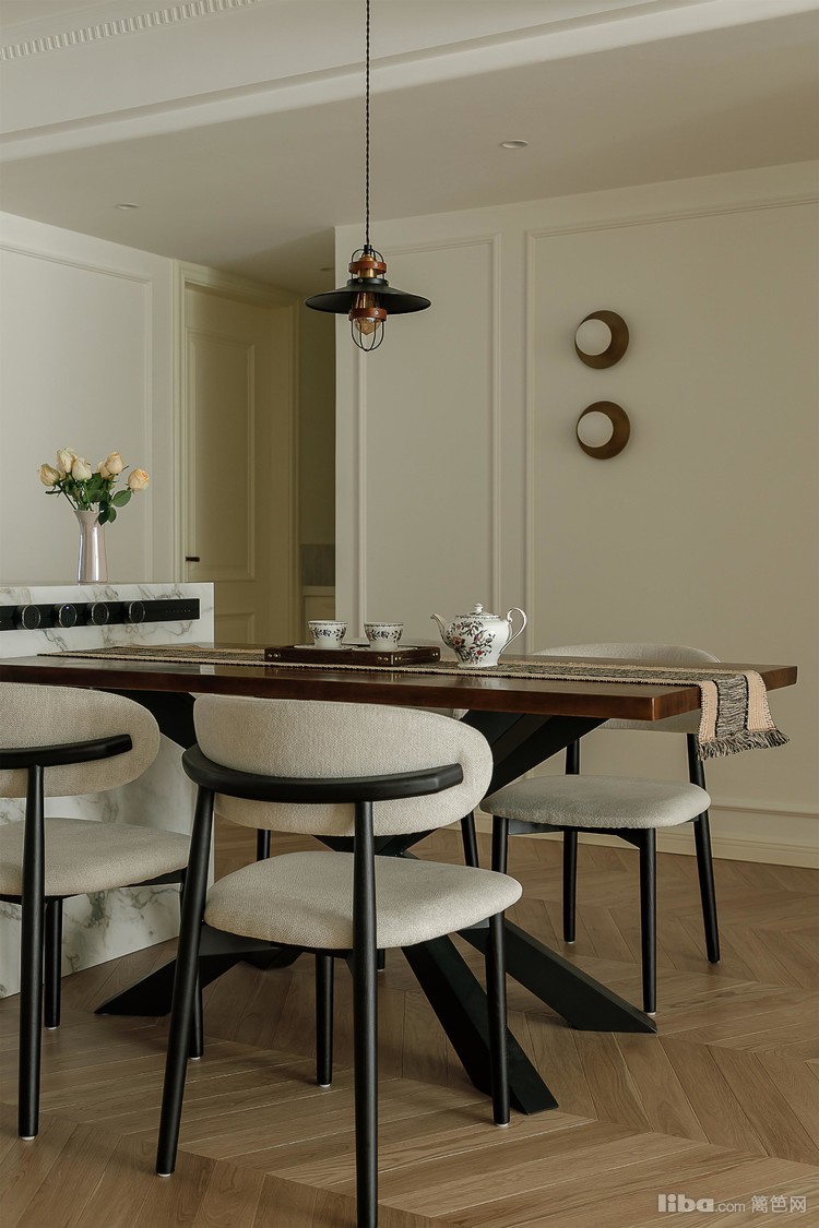 极简的石膏线条勾勒轻美式格调,浅色通铺人字形木地板加上胡桃木家具点缀,深浅木质对比让空间有种错落的层次感。