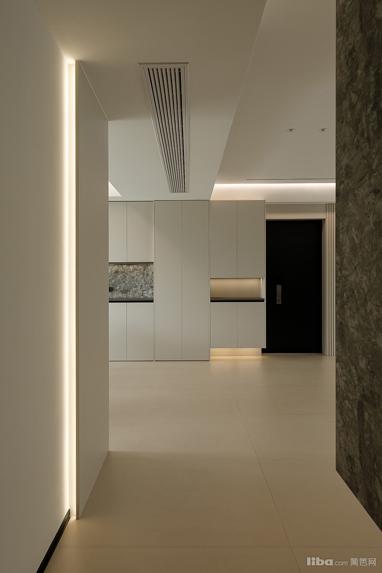 米白基色加棕咖配色,营造出沉稳雅致的空间质感,结合顶面餐边柜及顶面的氛围灯,透露出有秩序的高级感。