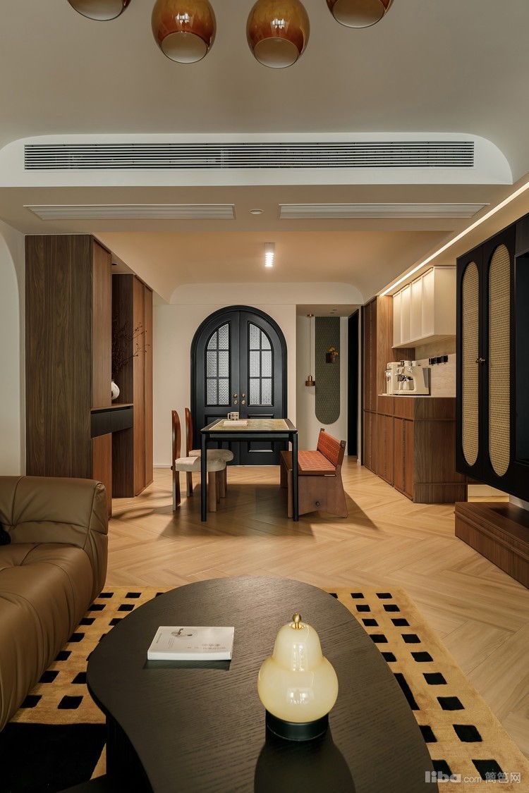全屋采用奶油白为主色系,奠定温馨的基调,配上胡桃色与黑色家具,增添复古气息。拱形、弧形的处理手法。