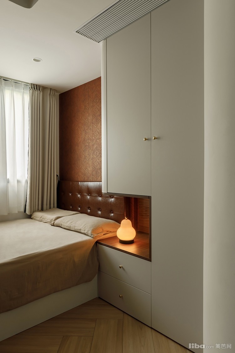 拆除非承重墙,增加了储物空间,木质护墙与黑色软包床头,营造出沉稳大气的氛围。