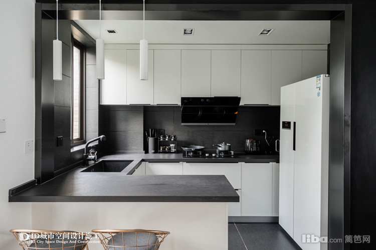 厨房橱柜的台面采用西班牙砂岩,相比石英石更有质感。