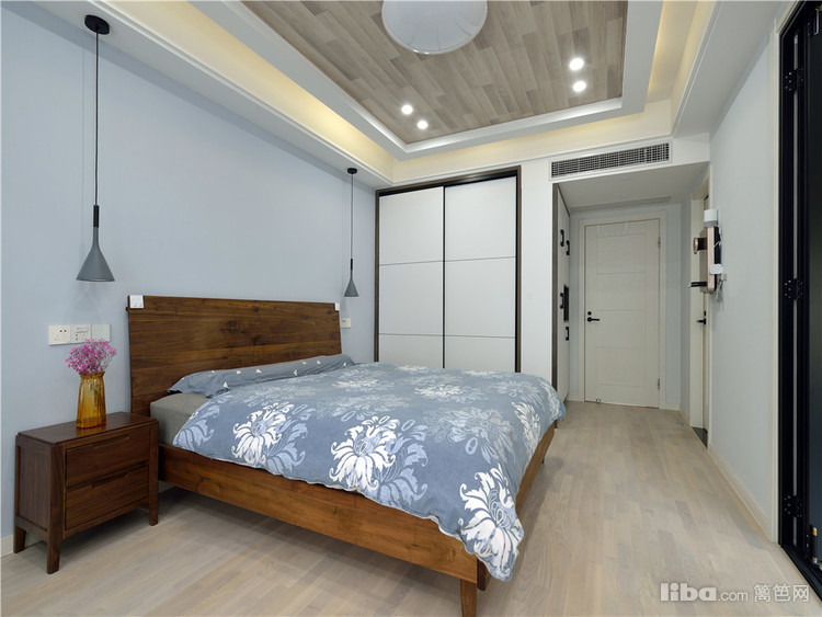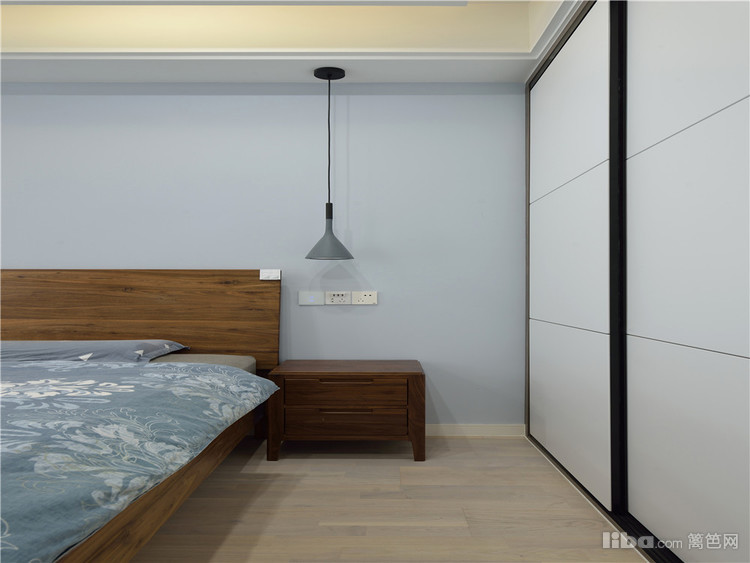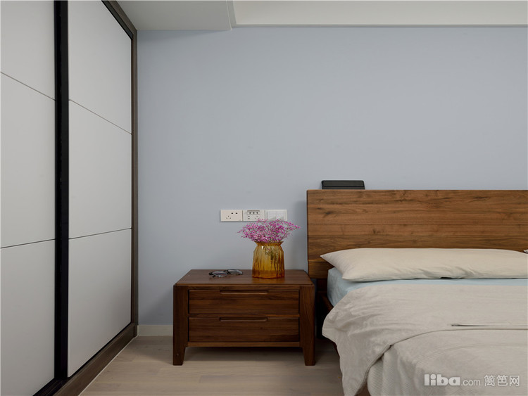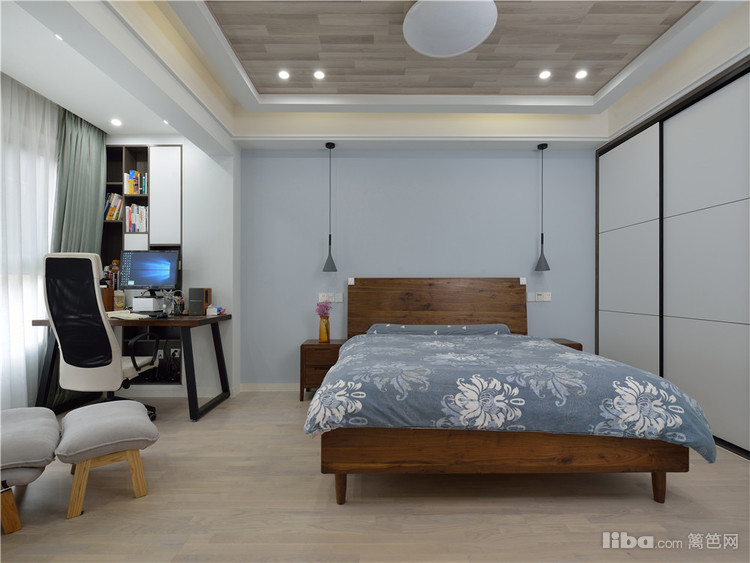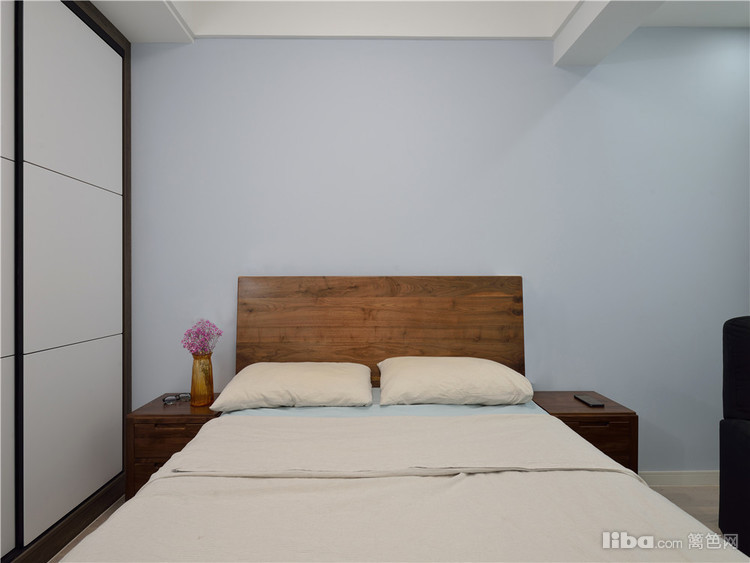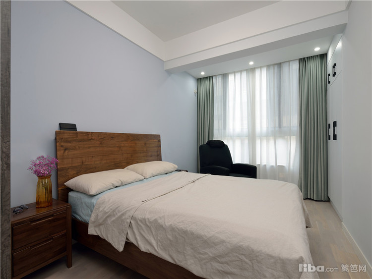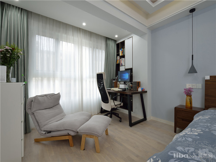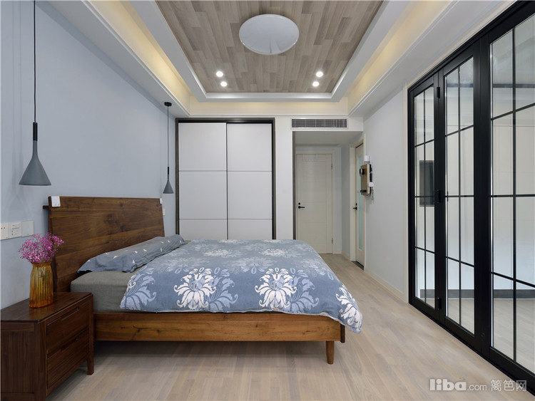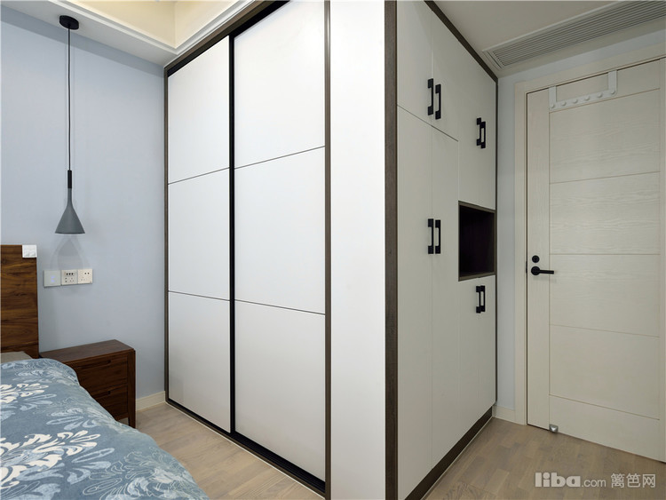 设计师设计打通了阳台,采用透明的黑框折叠门隔开了空间,简约时尚,同时也不影响卧室的光线摄入,这样既多了一个书房还多了个衣帽间,充分利用了空间。