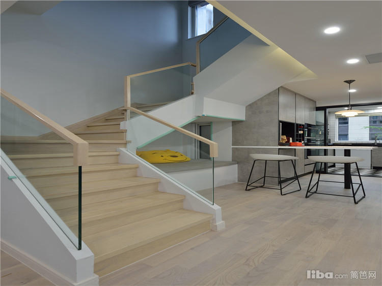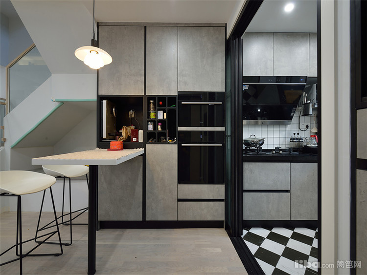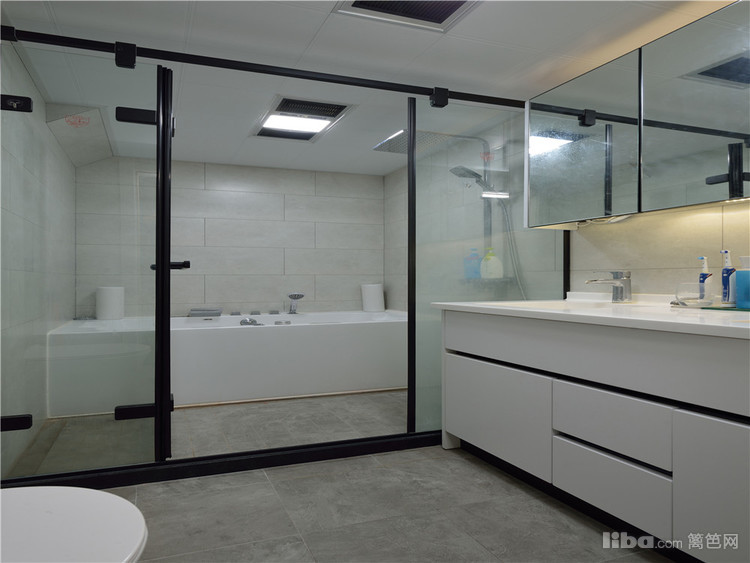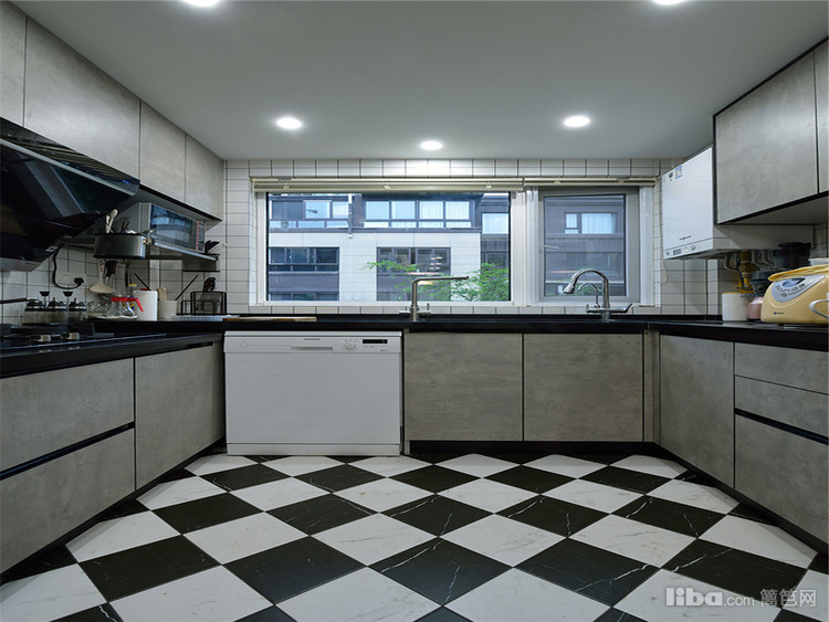 采用了灰,黑,白三色,简洁经典,为免太过于单调,地砖使用了黑白相间的几何砖,让整个空间链接起来,增加一些活泼感。