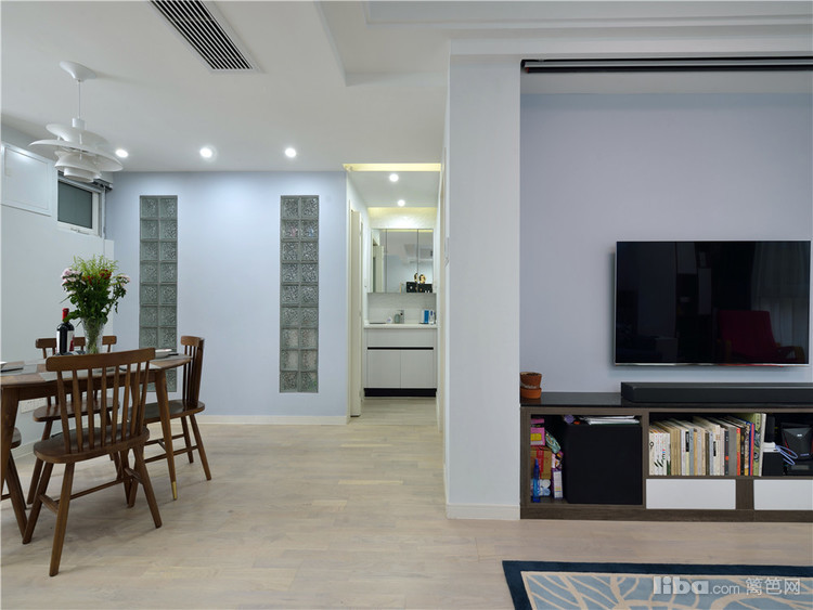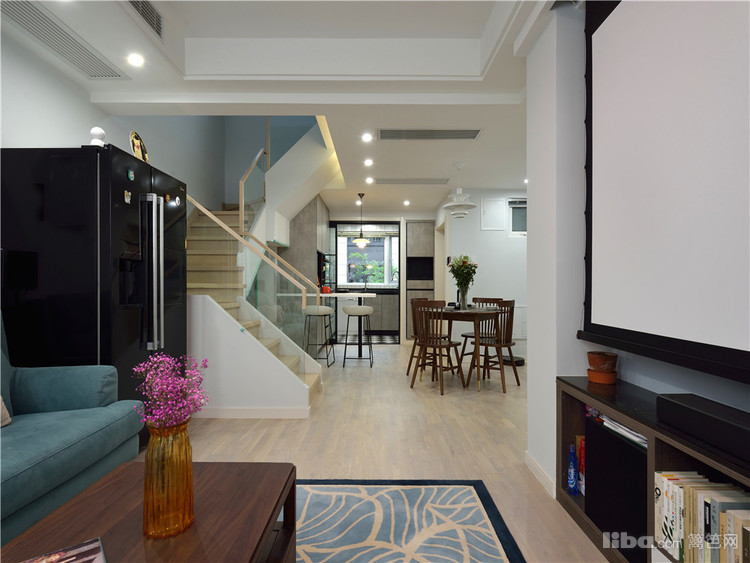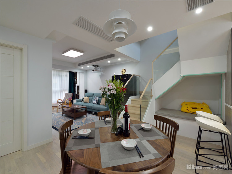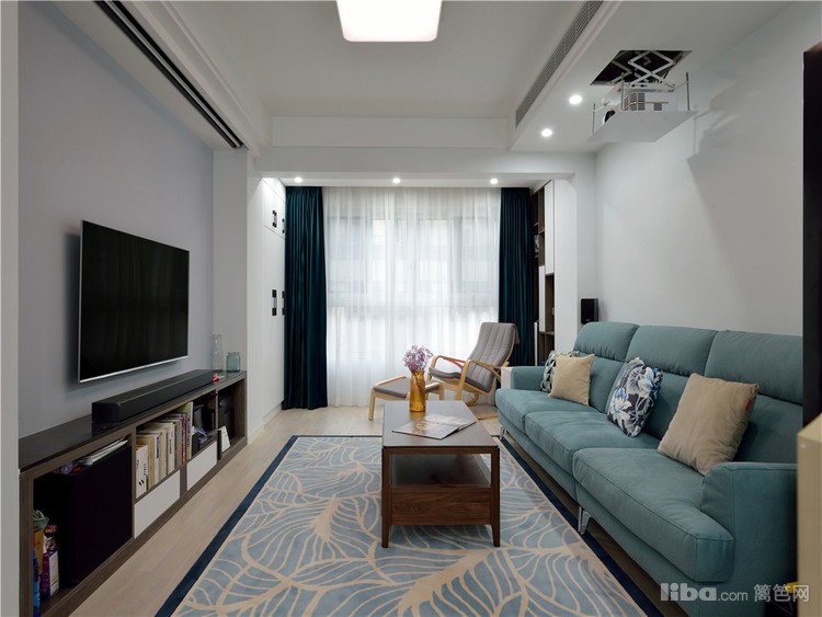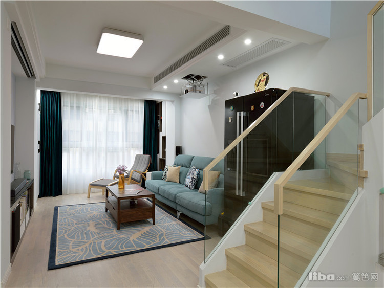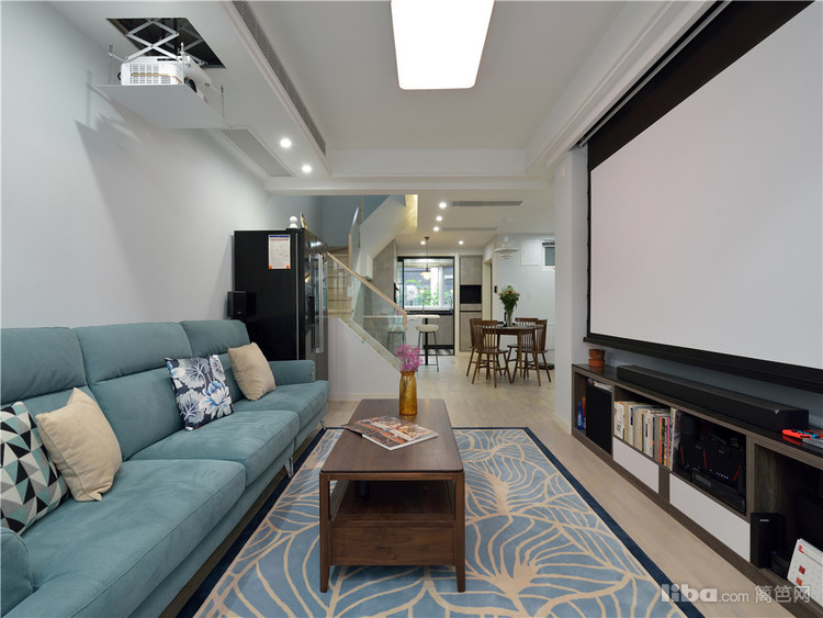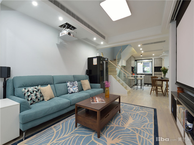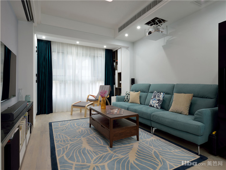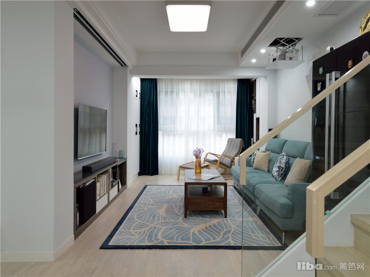 整个客厅主色为淡色,白色的橱柜,原木色的地板,湖蓝色的沙发,地毯上既有原木色又有湖蓝色,通过相近色让三者相互连接而不突兀。