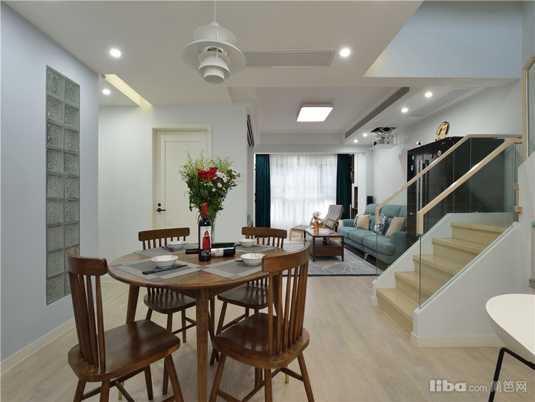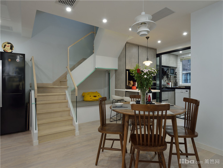 餐桌摒弃了常规的方桌,使用了胡桃木色的圆桌,圆桌能让人在心里上产生亲近感,让夫妻二人在忙于工作同时也增加夫妻感情交流的机会。