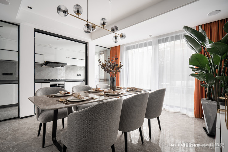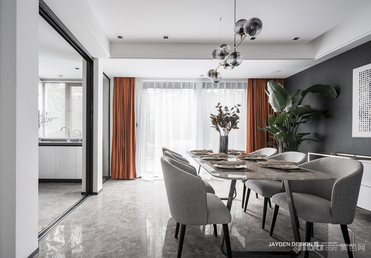 在业主希望封闭式厨房的前提下,我们用玻璃来取代厨房的墙面,让厨房和餐厅共享采光。