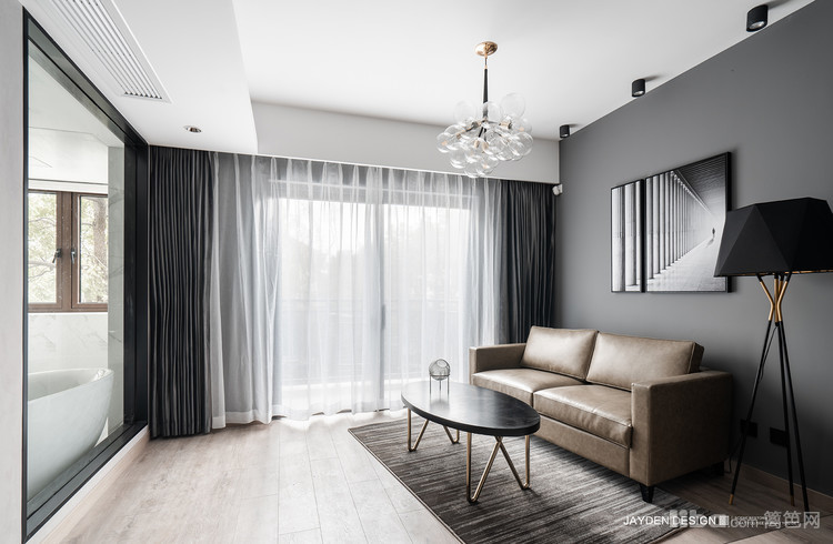 我们取消了沙发正对面的电视摆放,把不是很美观的电视放到了最里面。
