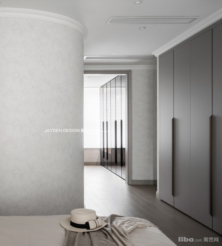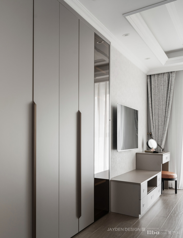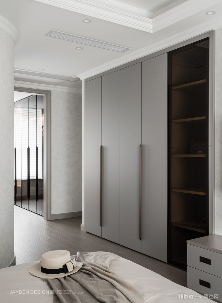 卧室内的衣柜和衣帽间的衣柜完美呼应。立面上的平整让空间更为方正,且具有一种视觉进深感。