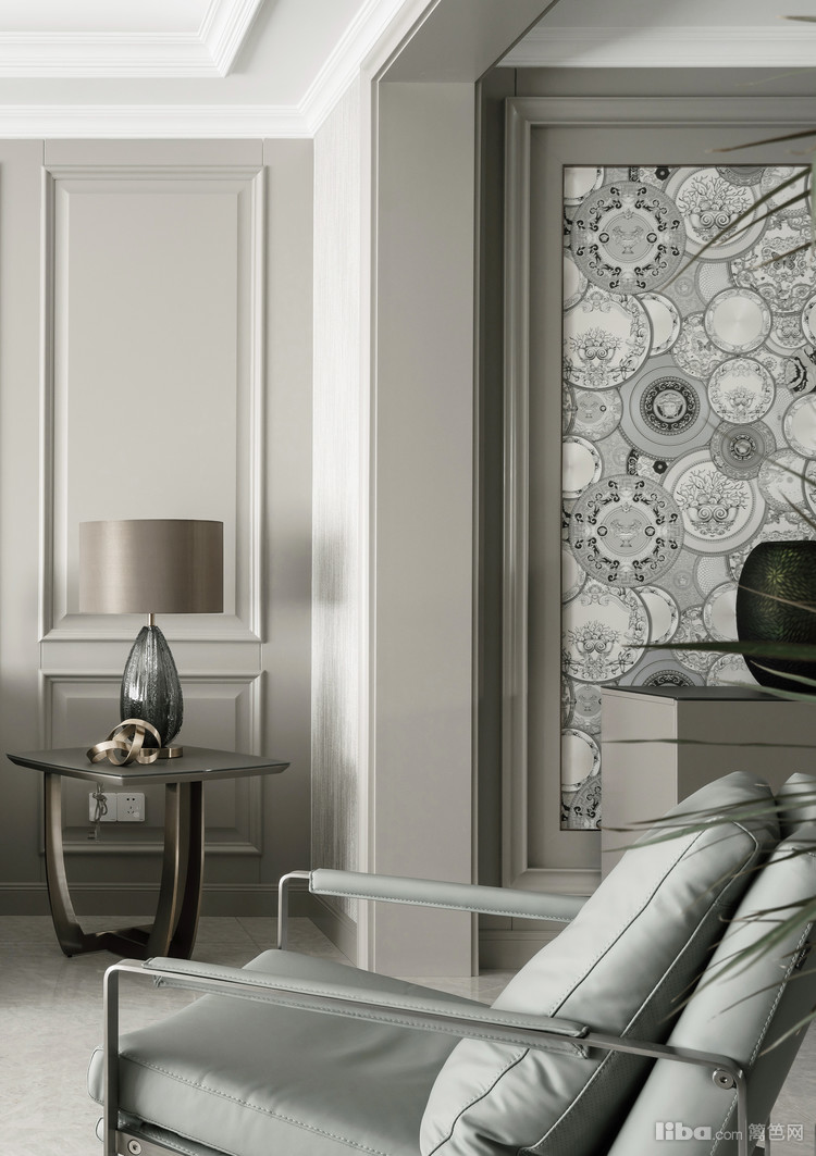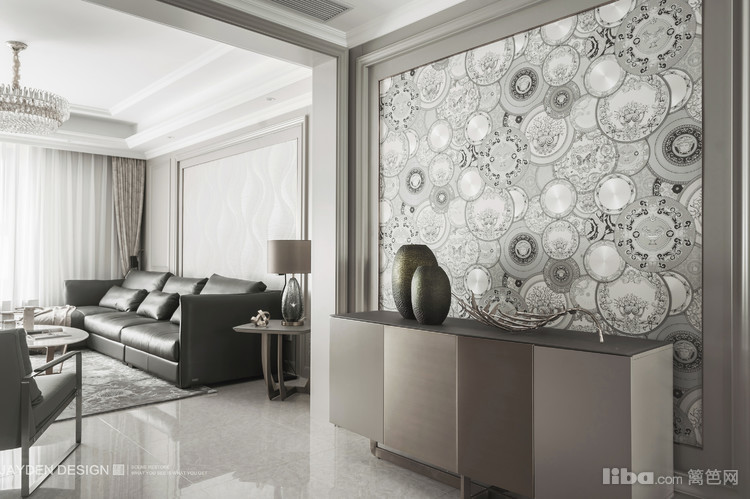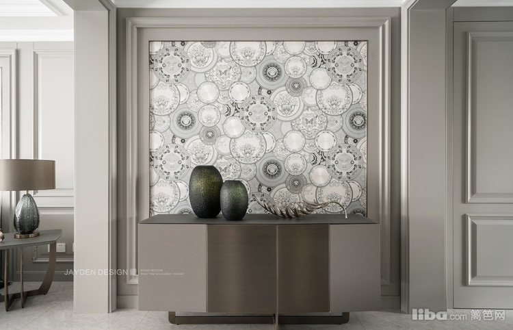 玄关以极赋仪式感的框景形式开启:温润如玉的实木边框内嵌VERSACE壁纸,搭配DEBRAH'S玄关柜