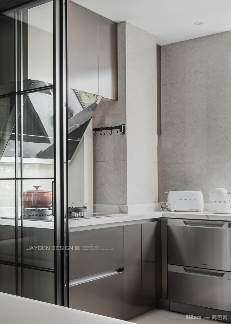 厨房采用轻质极窄边框玻璃移门,无下轨的设计让地面更为整体。